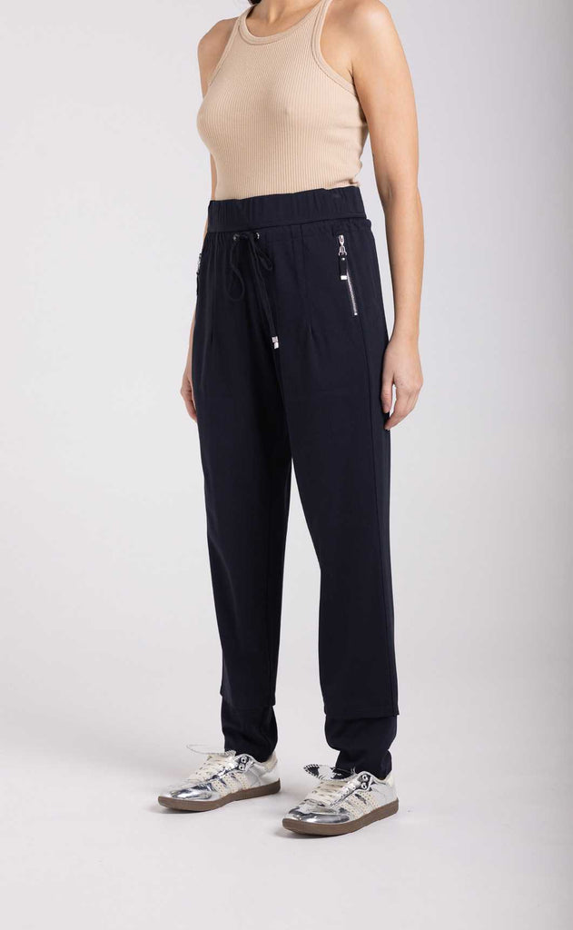 A perfect blend of drape and maximum stretch, these Navy Panel Pants are a year-round favorite, crafted in different fabric weights each season. Designed for ultimate comfort and flexibility, they offer a sporty yet sophisticated look, making them ideal for work, casual outings, or evenings out. Made from 75% Nylon & 25% Elastane, they feel as comfortable as track pants while maintaining a polished, slim-fit silhouette.