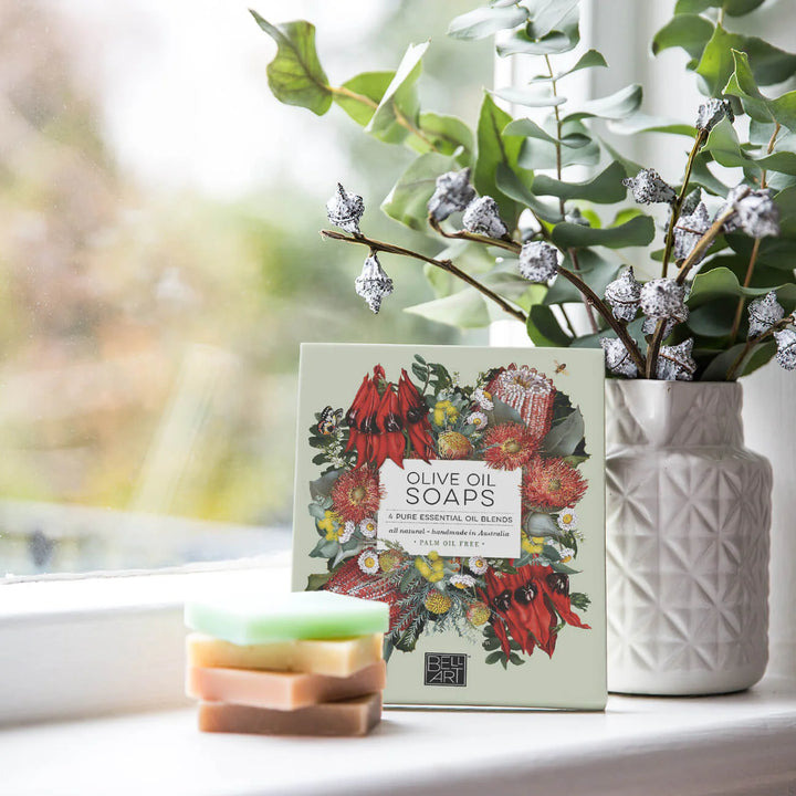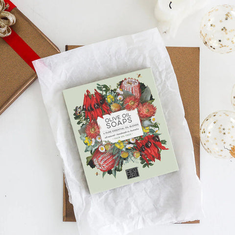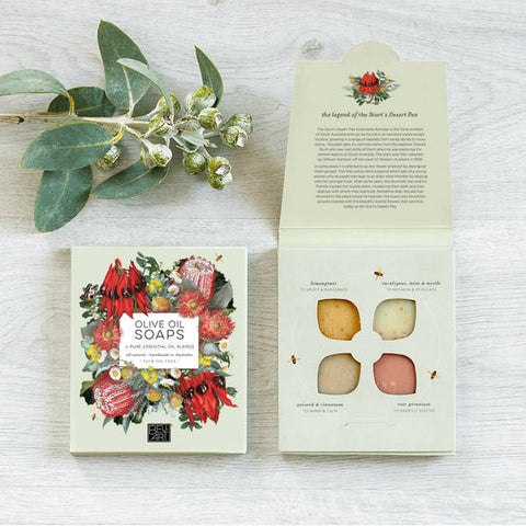 This lovely box of handmade olive oil soaps, made in the beautiful south-west of Western Australia, are fragranced with four different pure essential oil blends. All natural and palm oil free, enjoy the scents of Lemongrass, Eucalyptus Mint & Myrtle, Aniseed & Cinnamon and Rose Geranium. Featuring a striking arrangement of the Sturt Desert Pea, Mottlecah and Scarlet Banksia with a story of the origin of the Sturt Pea inside. A quintessential Australian souvenir this best seller makes a perfect and unique gift.