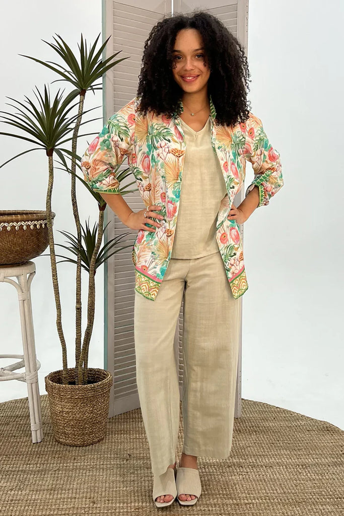 Discover effortless elegance with the Cienna Mona shirt. The silk viscose fabric features a vibrant floral print of lotus pods, proteas, ranunculus, ferns and palm leaves with beautiful results creating a sophisticated look that transitions seamlessly from day to evening. The contrasting collar, cuffs, and hemline add refined detail and visual interest, while long sleeves provide versatile coverage. Perfect for those who appreciate timeless design with a contemporary edge, this shirt is a wardrobe essential that pairs beautifully with your favourite pieces.