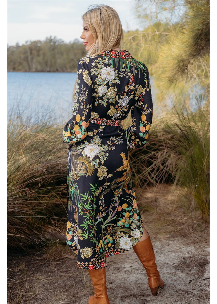 A masterful piece for trans-seasonal dressing, the Phoenix Night button through dress can be co-ordinated back with light or dark colours and the bold, eye catching print makes event dressing for cooler nights a breeze.