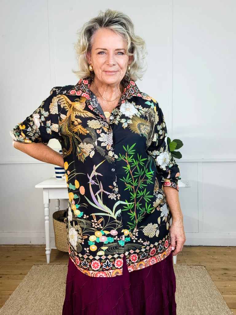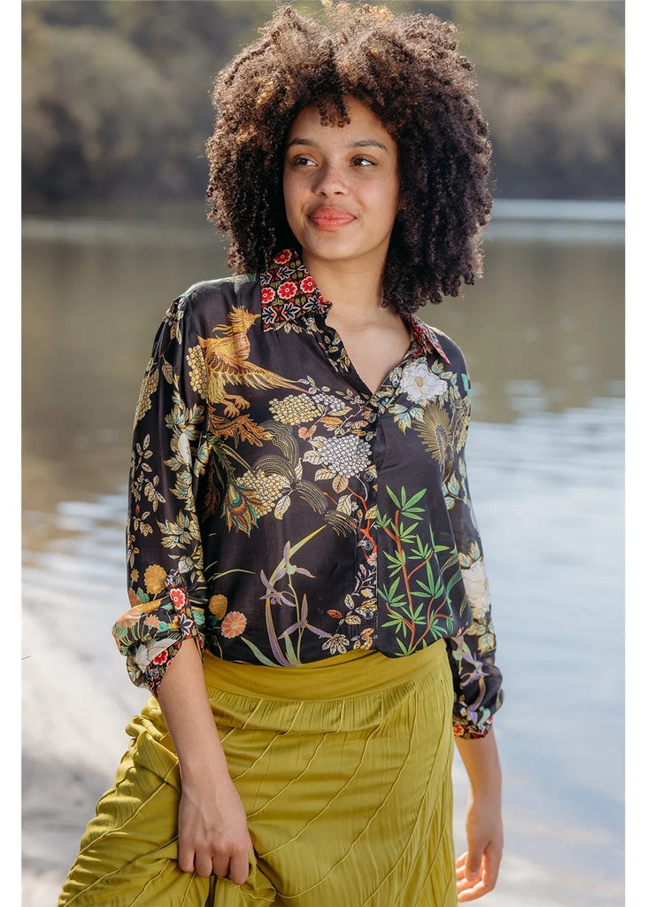 Another stunning print from Cienna, featuring the golden phoenix in a verdant garden of flowers. Tones of golden yellow, emerald green, beige, tan, lilac, aqua and white light up the black background. The contrasting floral motif collar, cuffs and border, pop in warmer red tones. Crafted from the lightest, softest Silk Viscose fabric, the Phoenix Night shirt will quickly become a favourite for its comfort and ease of styling.