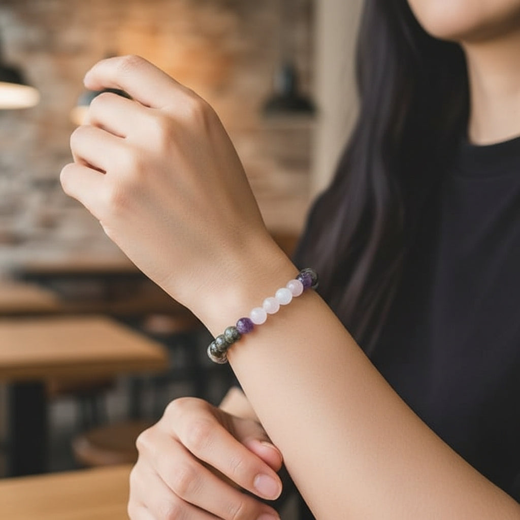 Three guardians for your calm, wrapped around your wrist. Amethyst brings a sense of quiet, Lepidolite gently gathers frayed nerves, and Lapis helps your thoughts feel clearer and more aligned. It’s the kind of bracelet you’ll reach for every day—easy to wear, beautiful to stack, and a subtle reminder to breathe deep and come back to yourself.