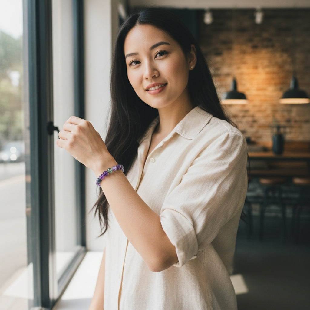 Three guardians for your calm, wrapped around your wrist. Amethyst brings a sense of quiet, Lepidolite gently gathers frayed nerves, and Lapis helps your thoughts feel clearer and more aligned. It’s the kind of bracelet you’ll reach for every day—easy to wear, beautiful to stack, and a subtle reminder to breathe deep and come back to yourself.