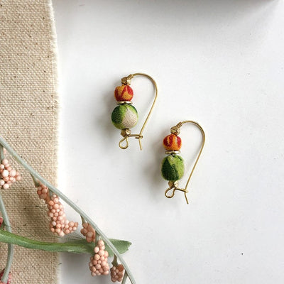 An open circle of 14 colorful Kantha beads form a modern statement post. The beads are crafted from repurposed Kantha textiles that have been wrapped around a bead base of salvaged wood. Colors & patterns will vary.