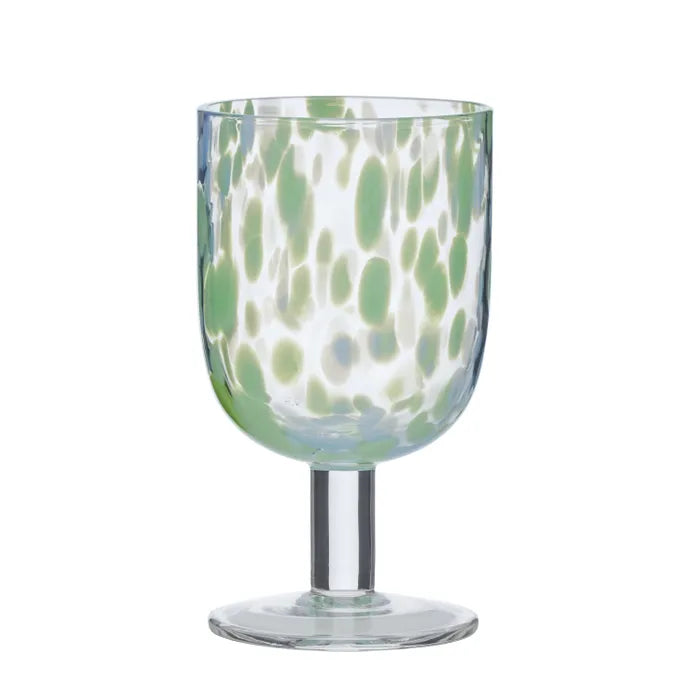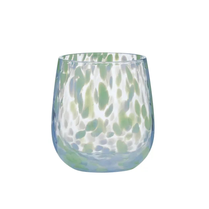 Gorgeous Freckled Glass drinks tumblers, each measuring 9x10cm, in tones of soft greens and sky blue.