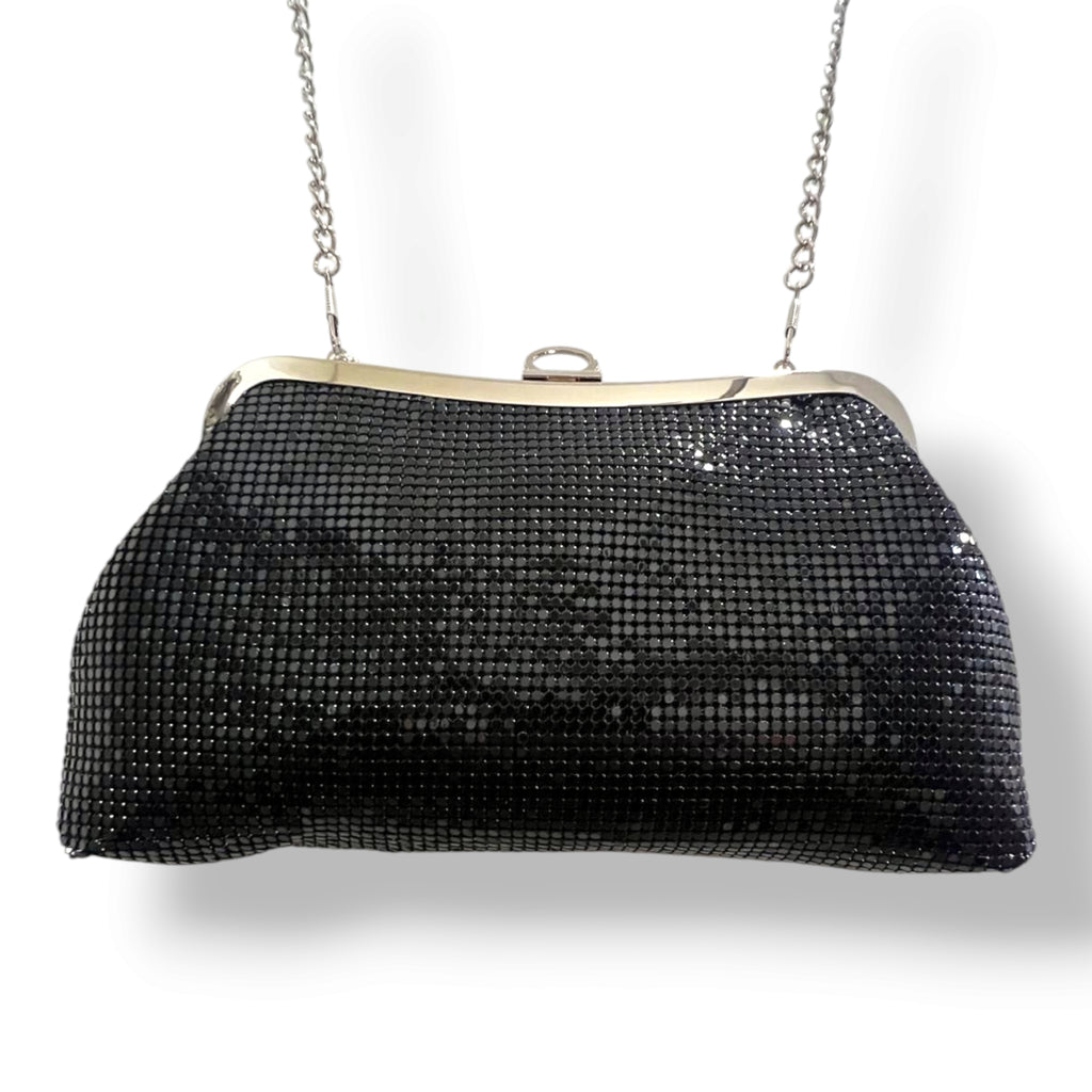Add a touch of vintage glamour to your wardrobe with the Glo-Mesh Shoulder Bag. This stunning black mesh bag features a silver-tone trim and chain strap, blending classic sophistication with contemporary charm. The softly ruched front design adds texture and dimension, making it a perfect accessory for evening outings, formal events, or stylish everyday wear.
