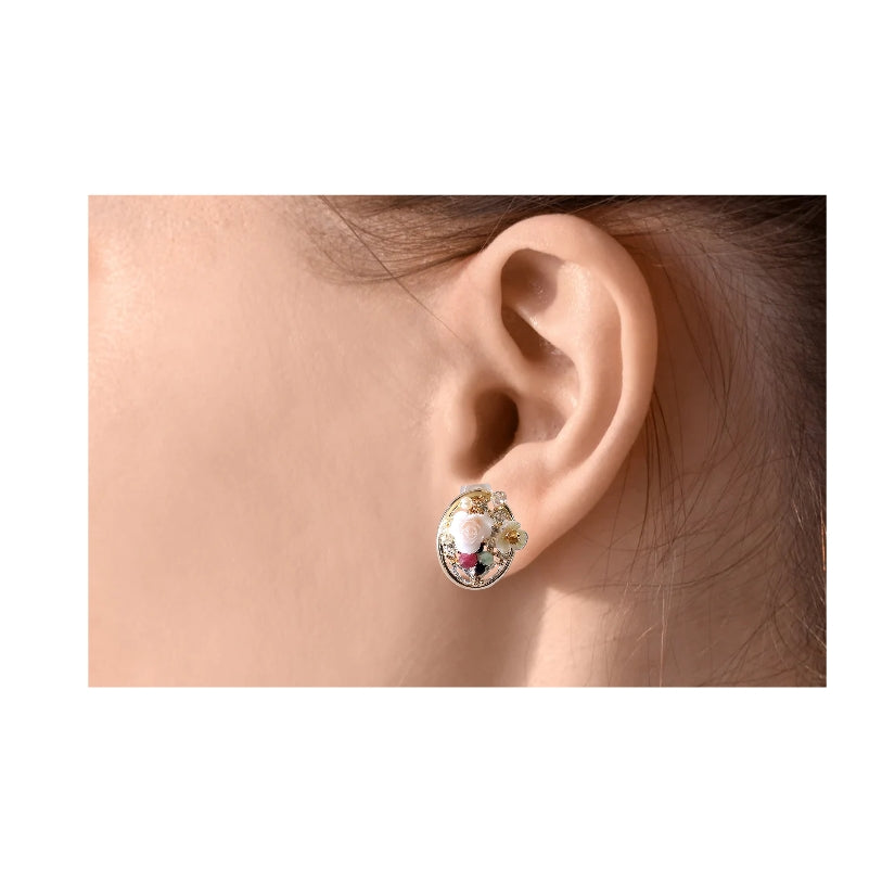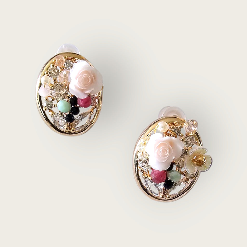 Step into a miniature garden with the Rosé Garden Oval Studs, where soft blush roses bloom amidst a bouquet of delicate crystals and pastel stones. Set within a golden oval frame, these earrings showcase intricate floral craftsmanship with carved roses, faceted gems, and petite pearl accents. Romantic and vintage-inspired, they add a refined charm to both everyday and occasion wear.