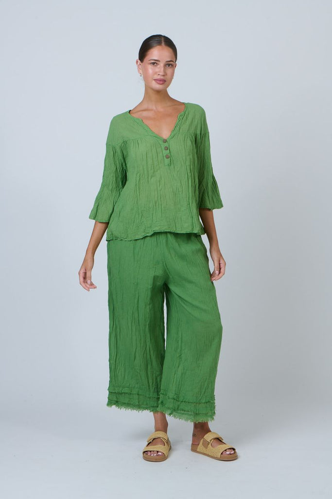 Three quarter bell sleeves add a gentle drape, making it a perfect match for it's co-ordinating bottoms - the Meadow Wide Leg Cotton Pants. An outfit ideal for slow days and casual gatherings