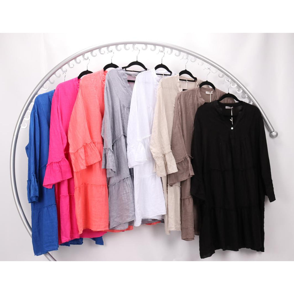 Cool comfort in Natural Linen . This easy styling Linen Dress features full length sleeves ending in a wide ruffled cuff, a narrow band collar with single button closure V Neck and gently gathered 2 tiered skirt falling to knee length. The style is loosely relaxed and flowing for coolness on warm summer days.