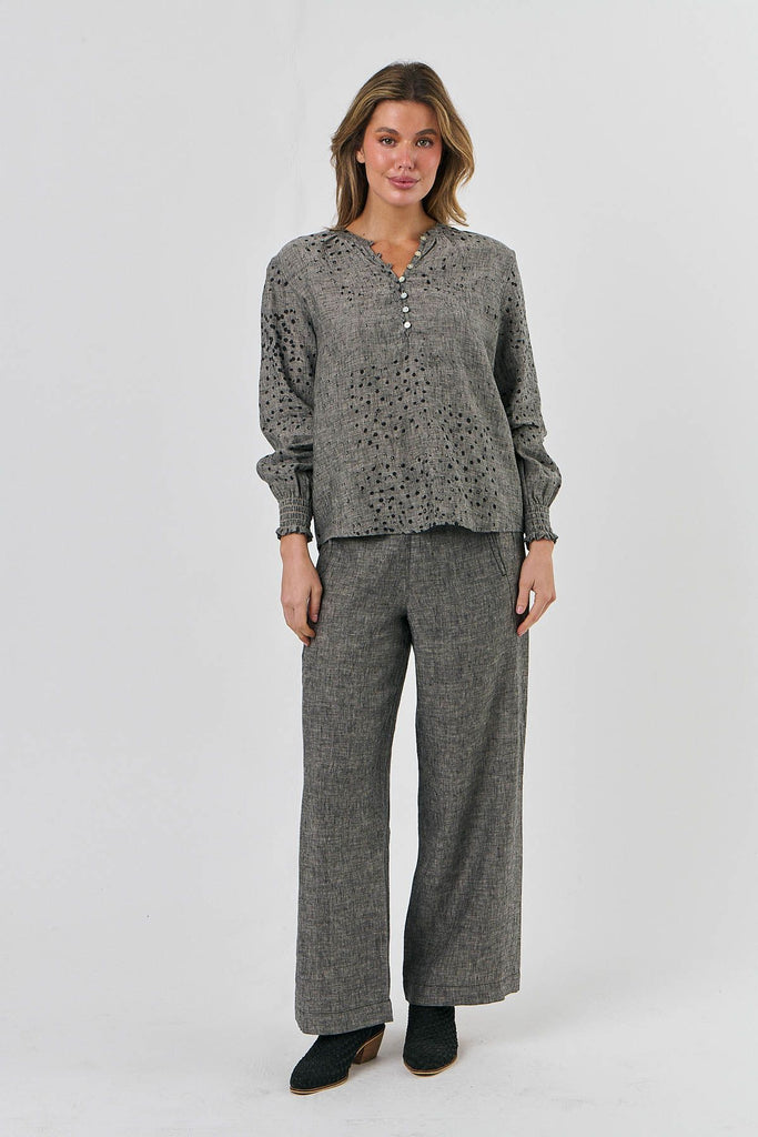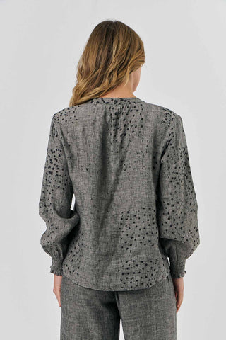 A Classic, elevated! This Naturals by Olive & Julie, long sleeve linen top, features a split Crew/ V Neck that can be worn open or buttoned up - partially or fully - with small mother of pearl buttons and a relaxed balloon sleeve with layers of shirred detail at the cuff. Crafted from 100% fine Linen, this elegant blouse is designed to be worn tucked in or left loose.