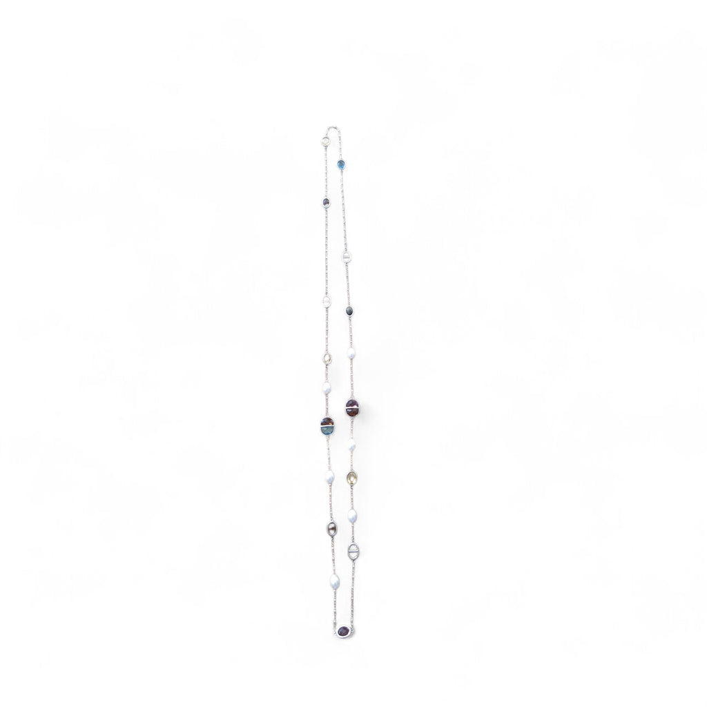 Elevate any outfit with this refined long-station chain, crafted to add just the right touch of sparkle and colour. Platinum-plated links are delicately punctuated with semi-precious gemstones, creating a graceful line that catches the light as you move. Elegant on its own and beautiful layered with your favourite pieces, this is the kind of necklace that instantly dresses up a simple tee, silk blouse or evening dress.