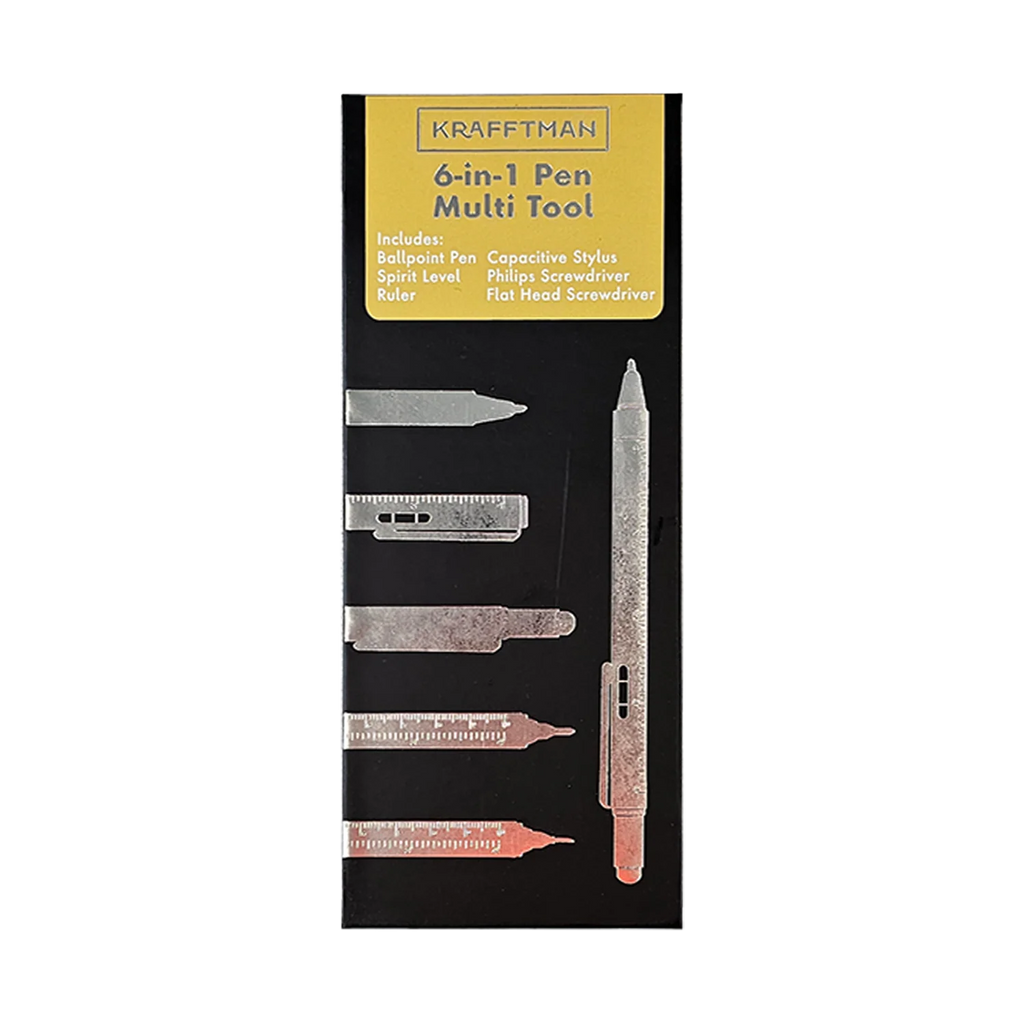 Compact and convenient, the Krafftman 6-in-1 Pen Multi Tool combines everyday essentials in one sleek design. This handy pocket companion features a ballpoint pen, capacitive stylus, spirit level, Phillips and Flat Head screwdrivers, plus a ruler—all housed in durable aluminium with a secure clip. Perfect for professionals, DIY enthusiasts, and anyone who values practicality without the bulk. One tool does it all.