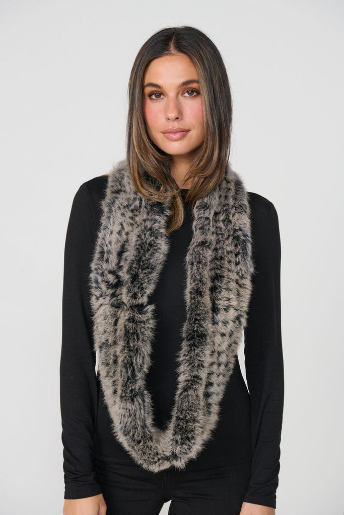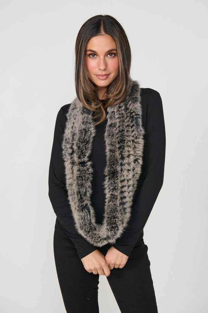 Caju's Rabbit Fur Snood brings luxurious warmth and texture to cold-weather styling. Crafted from full rabbit fur, this infinity loop scarf offers an exceptionally soft, plush feel in a beautiful Hedgehog colourway with mottled black and cream tones.