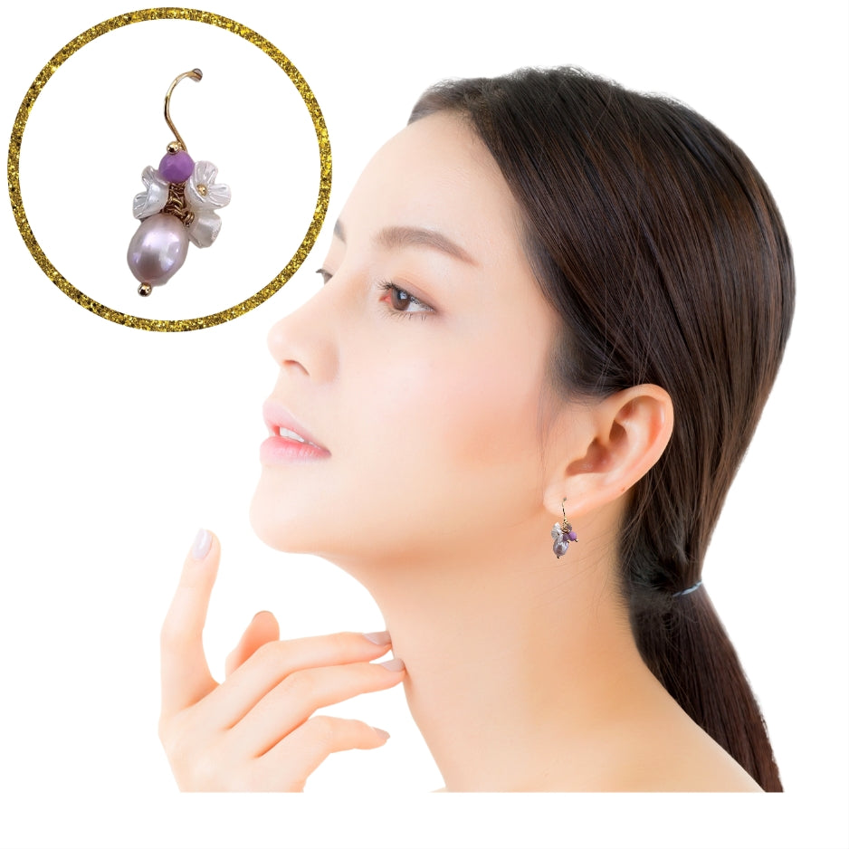 Delicate and charming, these Blossom Pearl Drop Earrings feature soft mauve freshwater pearls paired with hand-carved mother-of-pearl flowers and lilac gemstone accents. Suspended from elegant gold-toned hooks, each earring offers a graceful movement and a romantic floral aesthetic that adds a subtle glow to any ensemble. Perfect for garden weddings, brunches, or simply elevating your everyday style.