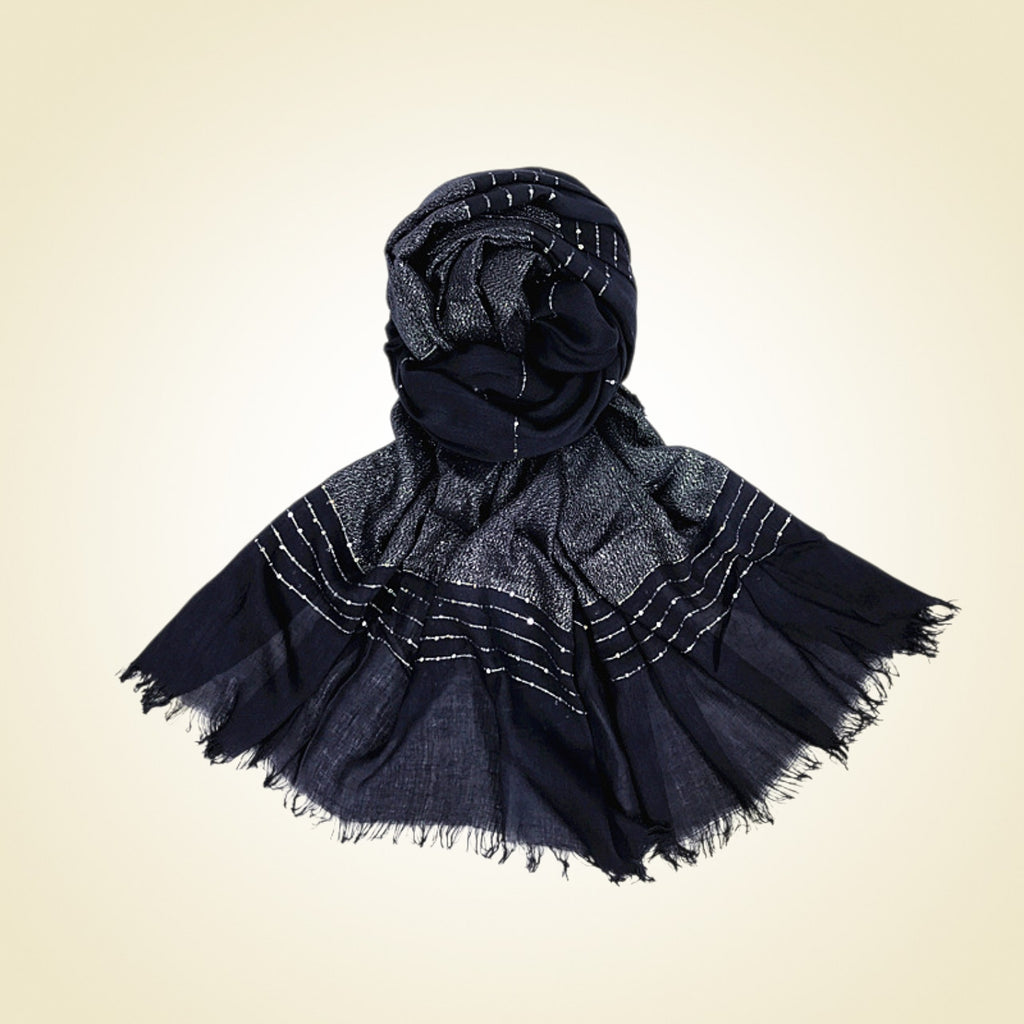 The classic navy base is elevated with subtle metallic thread detailing and fine linear accents, creating a refined shimmer that catches the light effortlessly. Finished with softly frayed edges, it brings a relaxed, artisanal feel—perfect for layering over both casual and evening outfits.