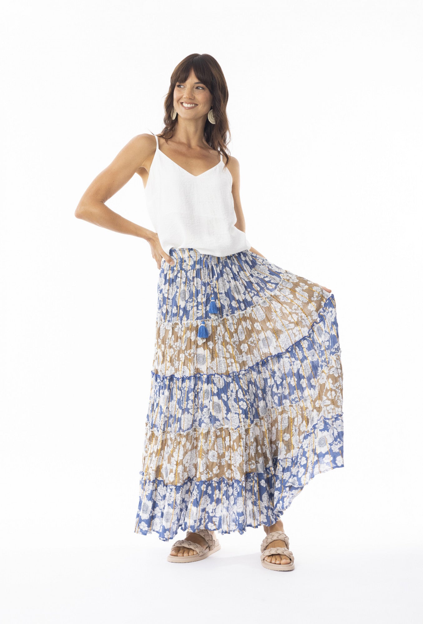 Leura Boho Frill Maxi Skirt by Cienna is a gorgeously layered skirt with a Floral Outlined Print in Cream, with shimmering Gold Highlights, on a Navy background. Crafted in a beautiful silk blend fabric, offering a soft, luxurious feel with every swish. The skirt includes a flat panelled front, with a...