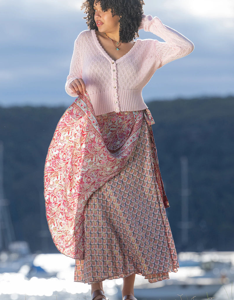 You'll love this gorgeous double layered wrap skirt from Cienna that will flatter many different body shapes and sizes. The Cleo wrap skirt features a vibrant print of deep red, rose, aqua, gray and and sand tones.