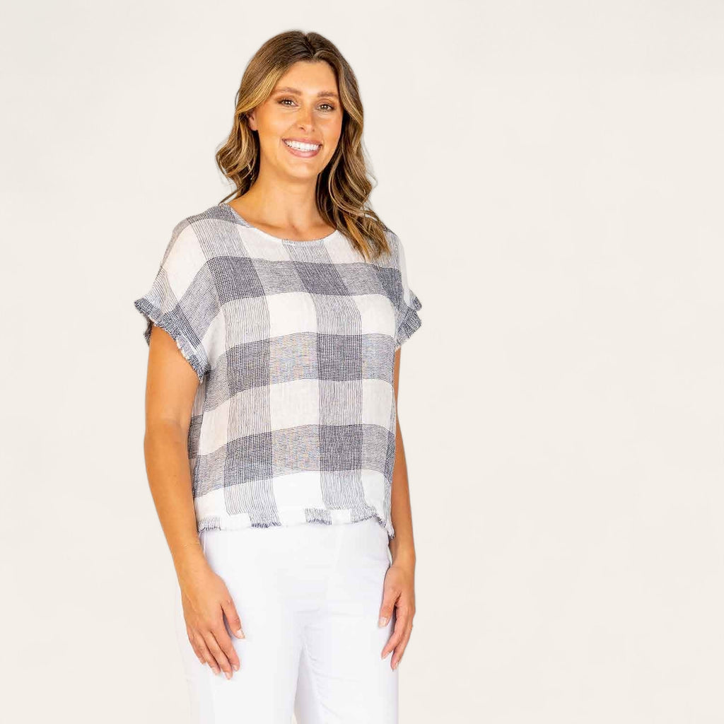 Texture and tone are the hero's in this Woven Linen Short Sleeve top in tones of Soft White & Navy Blue, featuring a bold linea Check Pattern. Wear this feature blouse back with navy, khaki, natural or white linen, denim or dress shorts. Such an simple shape to dress up or down for fuss free Summer co-ordinates.