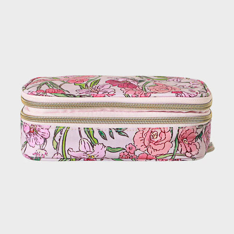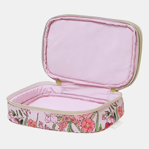 Crafted with sustainable cotton coated with PVC for easy care, this Makeup Organiser features the pretty Fleur Rose print with a recycled polyester lining in coordinating soft pink.