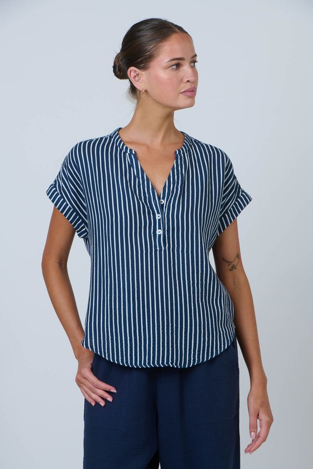 Channel timeless appeal with Namastai's Mooring Lines Textured Cheesecloth Top, crafted from 100% soft cheesecloth cotton, for breathable comfort. This top features a relaxed fit with dolman short sleeves, a partial button placket, collarless V neckline and elegant gathered back detail. The gently curved hemline flatters and pairs easily with trousers and skirts.