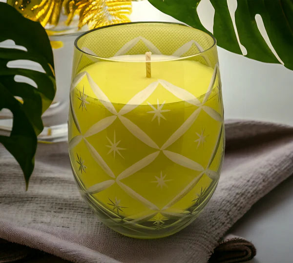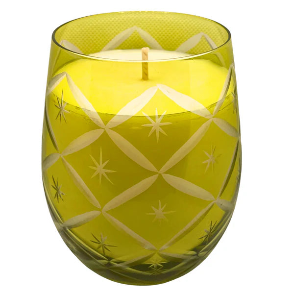 This gorgeous vessel features a green glass etched star pattern, adding a unique and playful twist to your home decor. Enjoy the soft glow and subtle scent of Fig and Olive, while adding a touch of fun to any room.