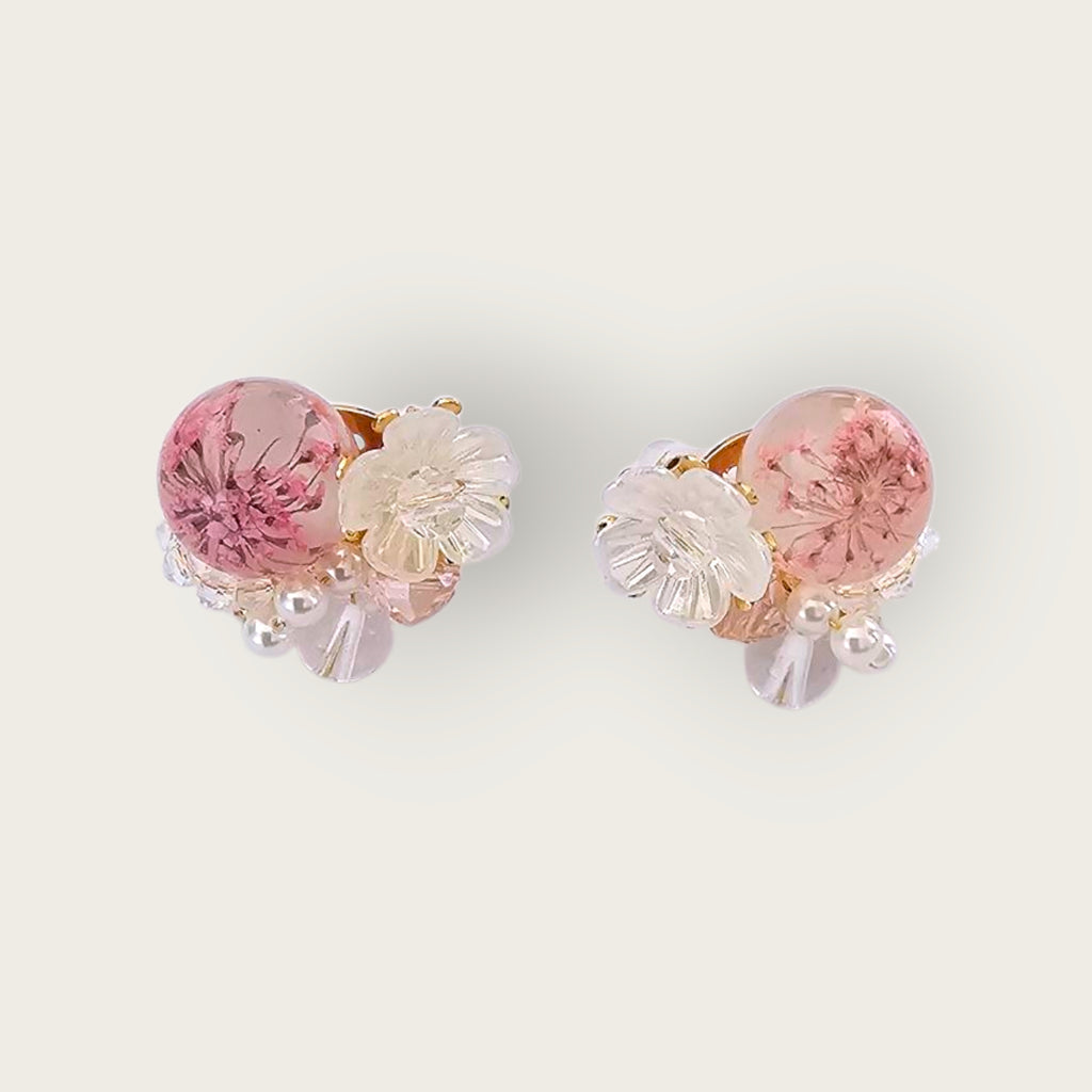 A delicate blend of nature and elegance, the Blossom Mist Dried Flower Studs feature real dried flowers encased in clear resin, preserving their beauty forever. Set against a base of soft freshwater paper pearls and accented with translucent floral motifs, these studs offer a poetic charm—perfect for those who appreciate handcrafted, nature-inspired jewelry.