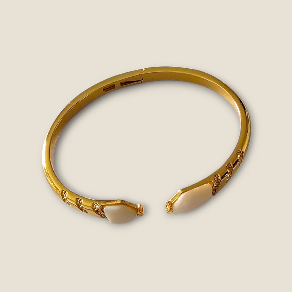 Elegant with a hint of vintage charm, this gold-tone open bangle features lustrous mother-of-pearl ends framed by delicate clear crystals. The curved design wraps softly around the wrist, secured with a discreet hinge for a seamless fit.
