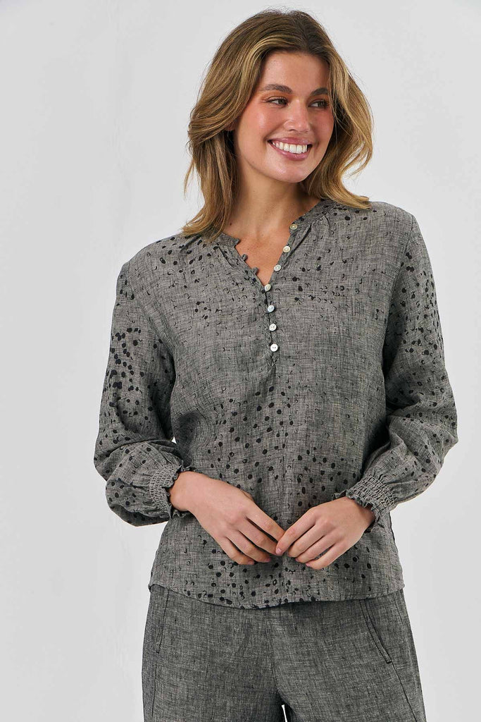 A Classic, elevated! This Naturals by Olive & Julie, long sleeve linen top, features a split Crew/ V Neck that can be worn open or buttoned up - partially or fully - with small mother of pearl buttons and a relaxed balloon sleeve with layers of shirred detail at the cuff. Crafted from 100% fine Linen, this elegant blouse is designed to be worn tucked in or left loose.