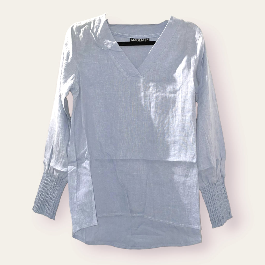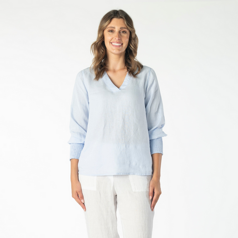 This Spring, the Renoma - V Neck Top Sky is a must-have staple in any wardrobe. It's designed with a flattering V-neck and elegant rouched trim around the sleeve hem, while also offering a comfortable and relaxed fit through the middle. Plus, it's made with top-quality linen material for a luxurious touch.