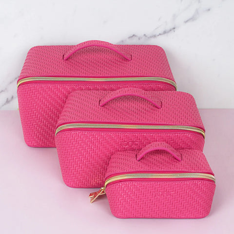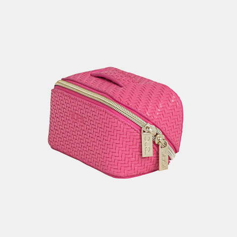 Tonic's stylish Herringbone Beauty Bag Small in Raspberry is a stylish and compact handbag accessory perfect for storing your beauty essentials. Crafted in a woven-look outer, this small beauty bag exudes a touch of elegance with its luxe double gold zip opening to reveal a thoughtfully designed internal compartment, providing ample space to organise your essential cosmetics. Additionally, an elasticated pocket offers convenience for storing smaller items such as hair accessories securely.