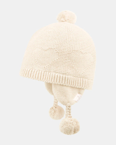 Toshi Earmuff Hearts is crafted from the finest quality certified 100% organic cotton yarn. Organic certification ensures the beanie is gentle on heads, as well as our precious environment. The beautifully textured melange yarn brings an element of refinement to this beanie. The Toshi baby beanie features ear flaps for cosy and nurturing protection from the elements. Delicately subtle heart shaped jacquard adorns our pretty baby beanie. Pom poms create a cute and whimsical look. The baby beanie Earmuff Heart is fully lined for enhanced comfort and greater warmth during our cooler months.
