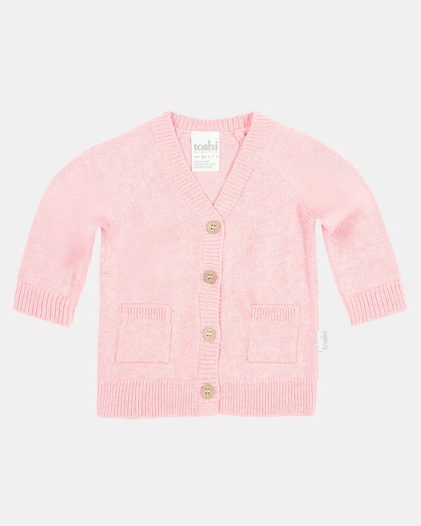 The sumptuously soft Toshi Organic Baby Cardigan Remy is crafted from the finest quality certified 100% organic cotton yarn. Organic certification ensures the cardigan is gentle on your delicate baby, as well as our precious environment. A melange yarn offers a level of refinement to this cosy and nurturing Toshi baby accessory. The styling is relaxed and loose fitting and creates a classic and yet contemporary feel. Traditional wooden buttons and functional pockets are featured. Cardigan Remy is designed to keep precious babies warm and cosy during our cooler months.