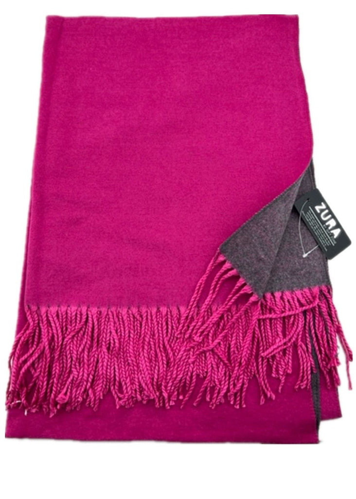 Crafted in a long rectangular silhouette with a generous width, this scarf drapes beautifully and can be styled in multiple ways — worn traditionally around the neck or adapted as a shawl across the shoulders for added warmth. The double-sided design features complementary colour pairings, such as fuchsia pink with grey, emerald green with navy or tan with grey, allowing you to switch up your look with ease. Finished with classic fringe edging, it brings a relaxed yet polished touch to casual winter outfits.